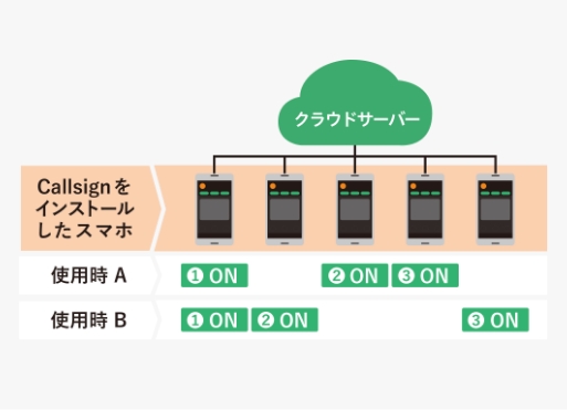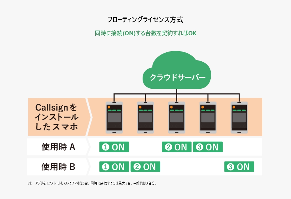 Callsignは「フローティングライセンス」方式です。同時に接続する台数分を契約いただけば、インストール台数は問いません。従来の無線機器では、次の使用者に機器を受け渡す必要がありましたが、スマホにCallsignをインストールしておけば受け渡しは不要です。また、同時に接続する台数を最適化することで、運用コストを抑えられます。