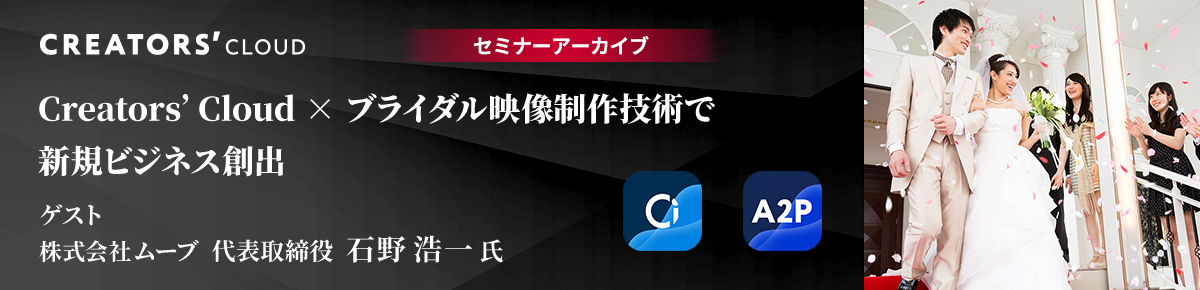 Creators’ Cloud × ブライダル映像制作技術で新規ビジネス創出 ゲスト 株式会社ムーブ 代表取締役 石野 浩一 氏 2024年10月30日(水)15:00〜16:00 Creators’ Cloud × ブライダル映像制作技術で新規ビジネス創出 ゲスト 株式会社ムーブ 代表取締役 石野 浩一 氏 2024年10月30日(水)15:00〜16:00