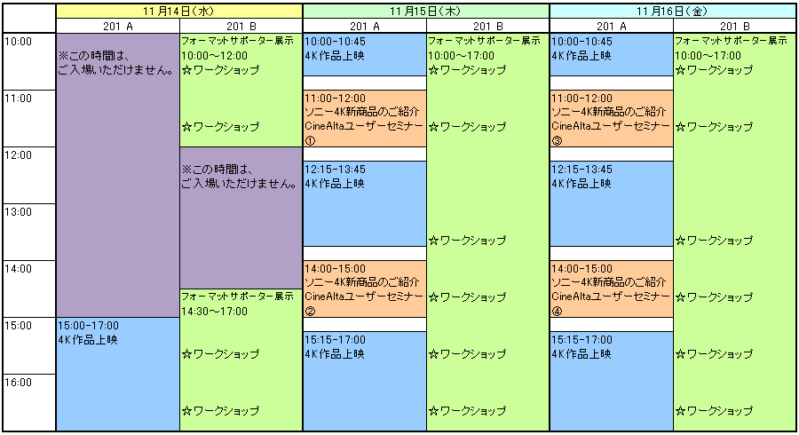 国際会議場201 A/B会議室では、4K・ハイエンド映像制作にかかわる最新情報をお届けする場として、以下のイベントを開催いたします。