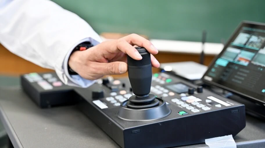 金子教諭「きっかけは、コロナ禍での出席停止等の生徒に対しての学習支援のために、授業の配信を始めたことでした。固定したiPad1台で行う授業配信では、配信先の生徒には授業の見たい部分が上手く見られていないのではないかと感じていました。そこで、私が担当する理科の授業を行う物理化学室では、スイッチャーを使って画面を切り替えたり、分割したりしながら、教室のディスプレイに映している画像やハンディカメラで写した教室の様子を配信する取り組みを始めました。配信した授業の映像は同時に録画されて残るので、この授業の記録も利活用できるのではないかと考えたのです。はじめは、授業をしながらハンディカメラを手動で動かして黒板や実験の手元、発表する生徒の様子を撮影していましたが、授業者が授業そのものに専念できる形にしたいと以前から考えていました。