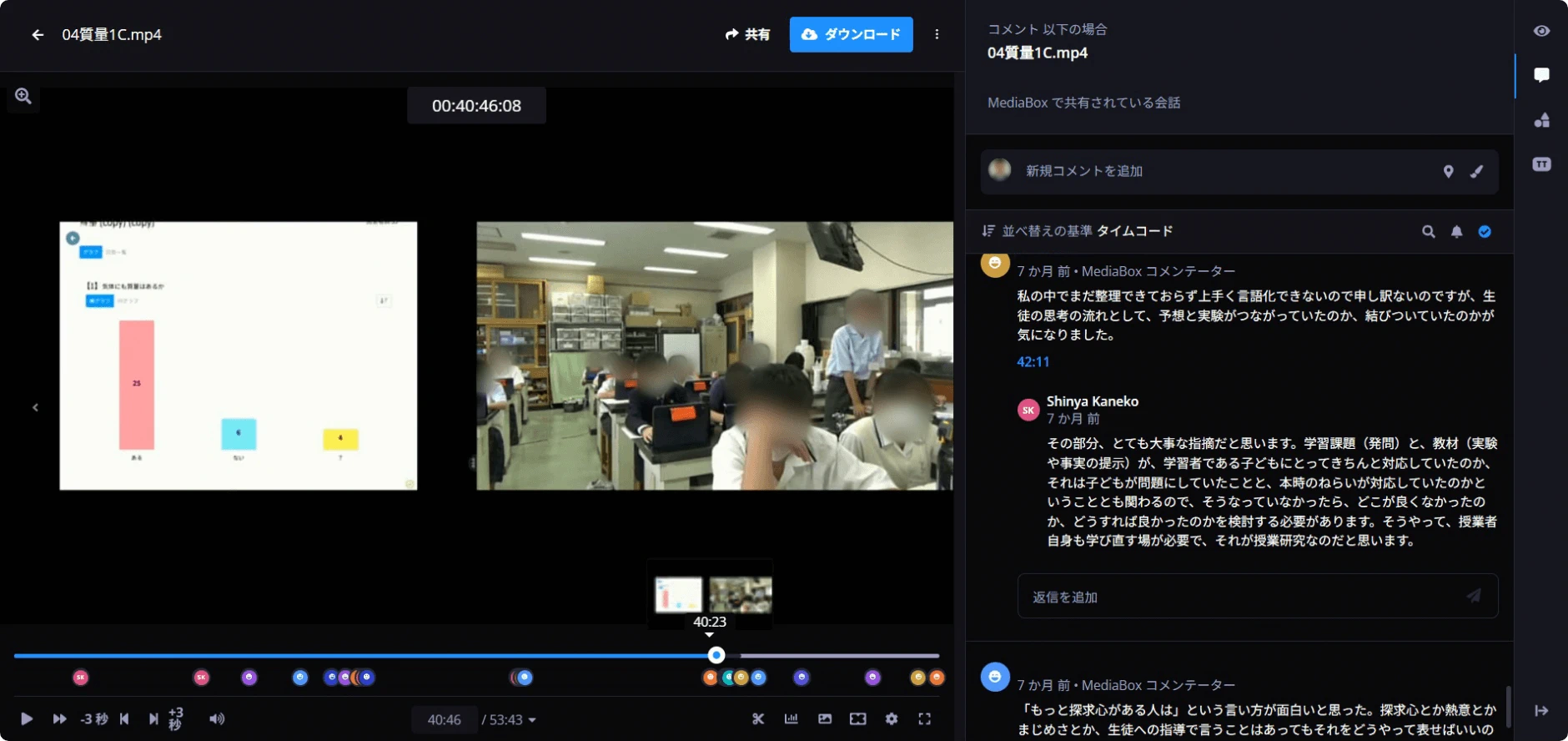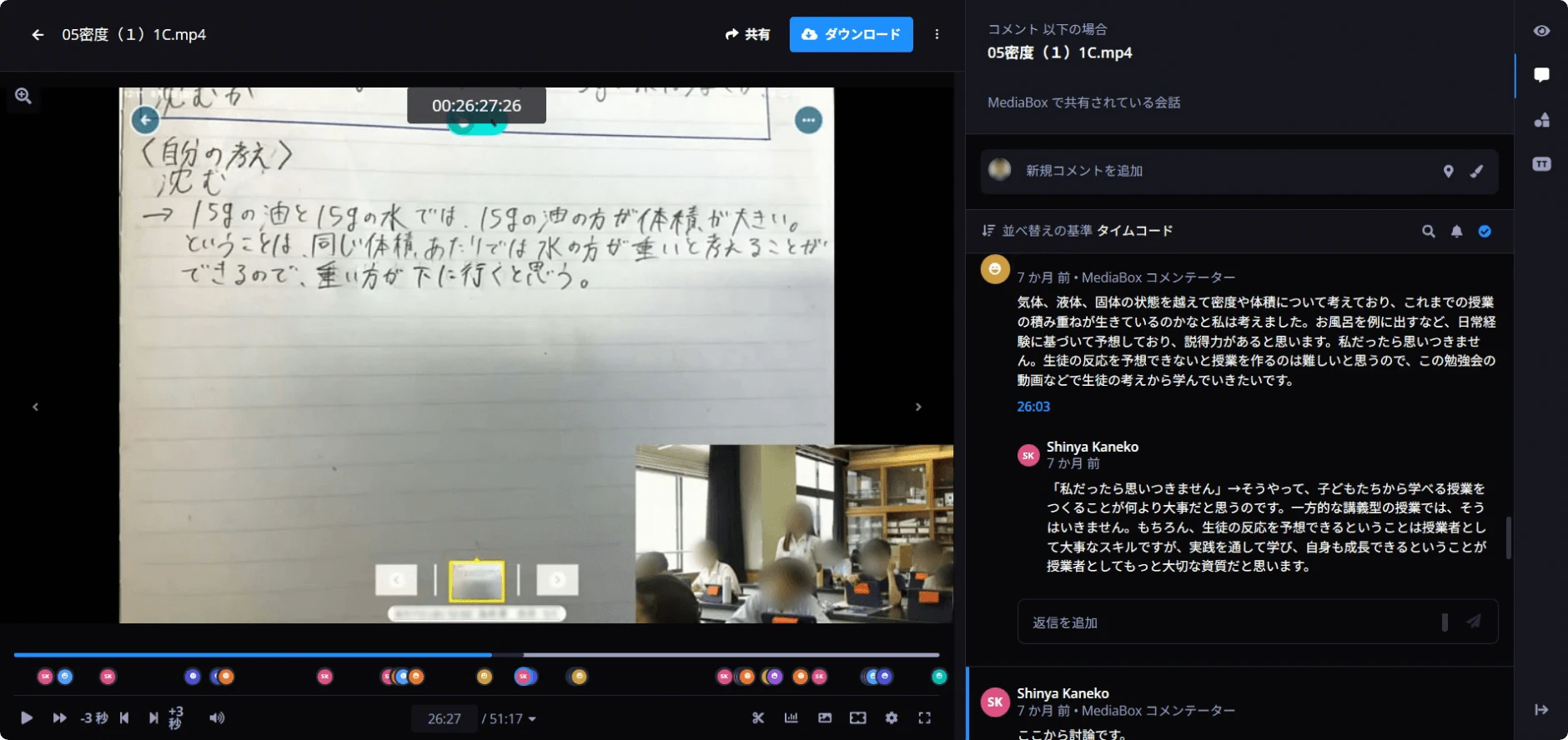 金子教諭「Ci Media Cloudにはタイムライン上にコメントをつけられる機能があり、授業等の動画を視聴した他の先生や学生とやりとりしたり、質問に答えたりすることもできます。試験運用中、東京学芸大学の教職課程の学生にCi Media Cloudで私の授業を事前に視聴してもらい、その後にオンラインで集まって、授業の解説をしたり、意見交換を行ったりする学習会を行いました。単位にならないのにも関わらず、30名ほどの学生が手を挙げて参加してくれました。その際、学生たちから『授業を見られる機会が増えてありがたかった』といった声や、『実際の授業の映像とともに現場の先生の話が聞けたのがよかった』、『対面の場で意見を求められるとすぐに自分の考えをまとめて発言するのが大変だが、オンデマンドで映像を何度か見て、時間をかけて考えを整理することができた』といった感想が聞かれました。授業研究や研修において対面での授業参観が重要であることは変わりませんが、先生方も学生もなかなか教室に直接足を運ぶ時間がとれないこともありますし、そうしたときに生かせるオンデマンドならではのメリットもあると改めて認識する機会となりました。」