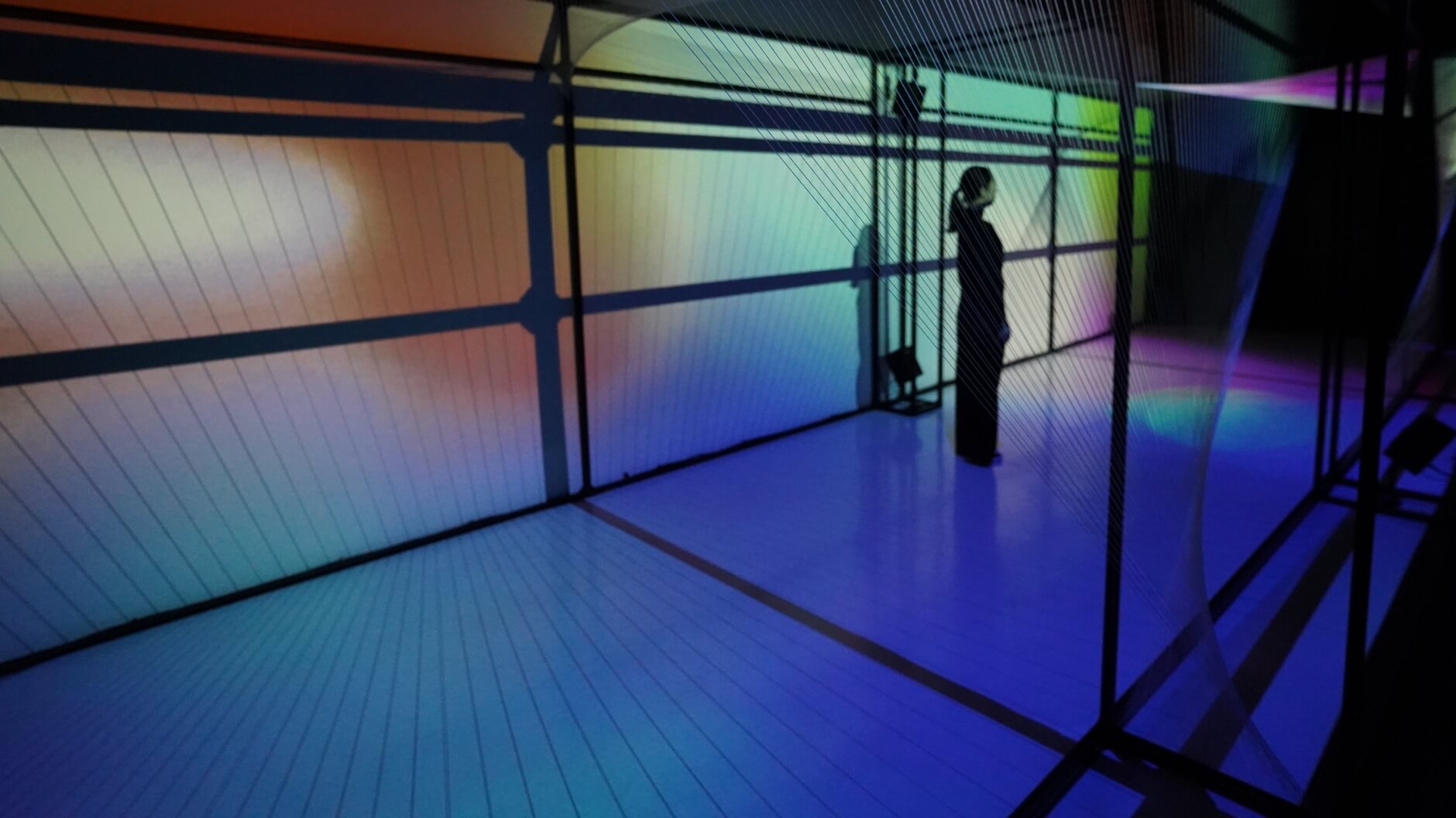 映像の演出では、天井から放射状に張り巡らされた糸に、それぞれの環境をイメージした色合いの抽象的なプロジェクションマッピングを行うことで、より音に集中し没入できる空間を構築しました。また、スピーカーから発する微振動を体全体で浴びることからも、“ひびきにふれる”展示をめざしました。