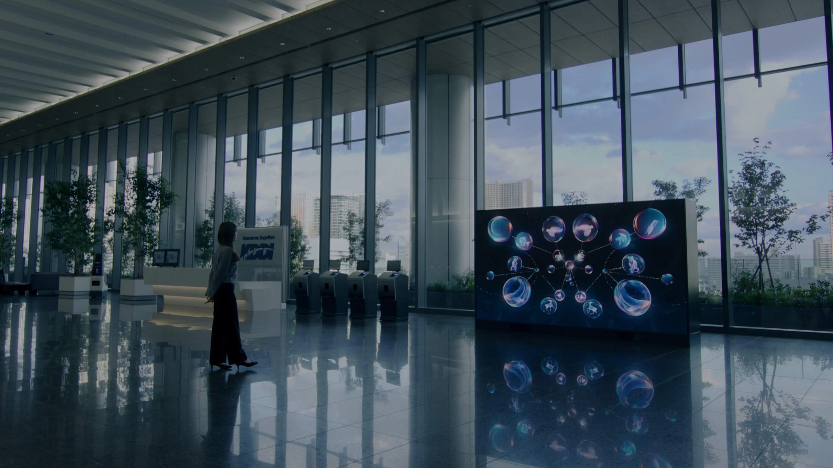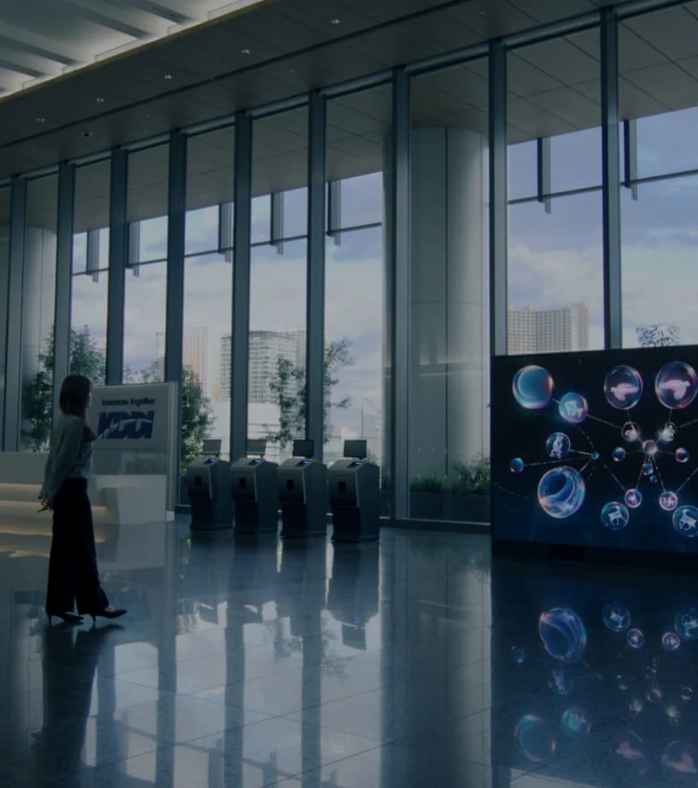 2025年4月から「TAKANAWA GATEWAY CITY」のTHE LINKPILLAR 1 NORTHに本社を順次移転し、2025年7月に新本社のグランドオープンを迎えたKDDI株式会社(以下、KDDI)。新本社は「つなぐチカラを進化させ、ワクワクする未来を発信し続けるConnectable City」をコンセプトに掲げています。この場所は、KDDIグループだけでなくお客さまやパートナーとともに新たなアイデアを共創し、発信し続ける「街」のような役割を果たすことをめざしています。この中で、ソニーはKDDIの世界観を伝えるオフィスエントランスでの来訪体験を演出する映像プランニングと、LEDディスプレイ『Crystal LED』の納入を担当しました。