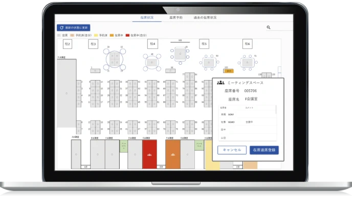在席状況がリアルタイムに反映され、「だれがどこに座っているか」の現在の状況がわかります。スマートフォンでも閲覧でき、座席表の拡大縮小にも対応。在席中のユーザー検索も可能です。