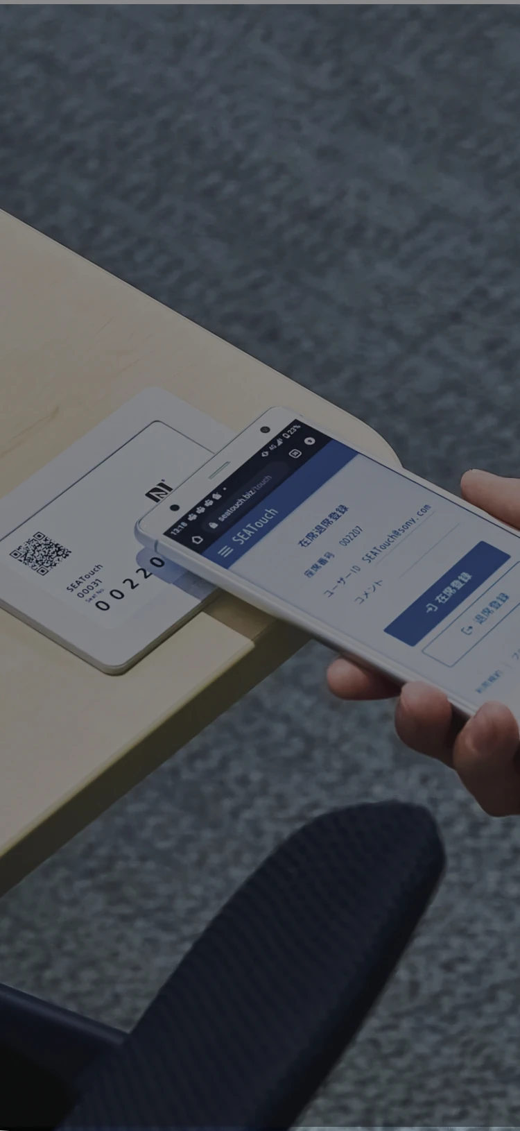 座席に設置したカードにスマートフォンをタッチして座席登録ができる、