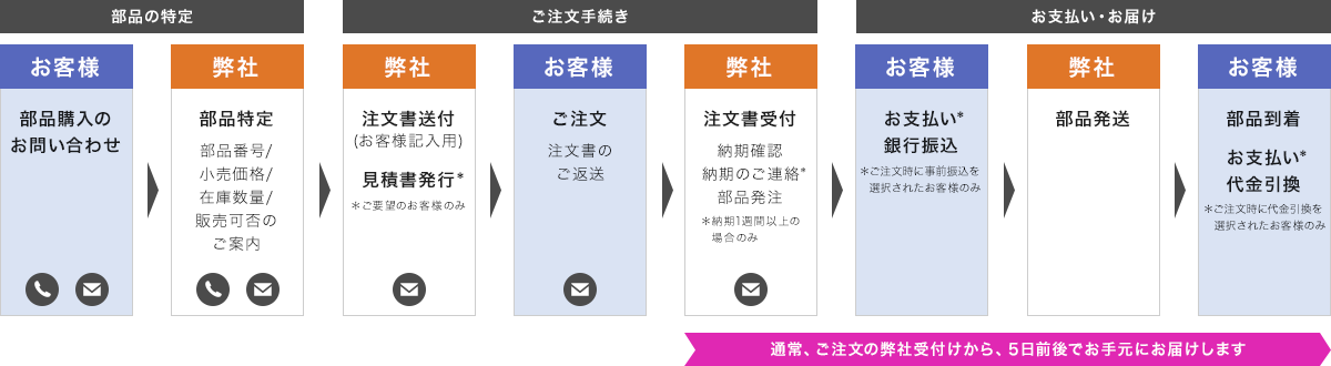 お支払い完了の確認、並びにご注文いただいた部品の確保ができ次第、部品の発送をいたします。