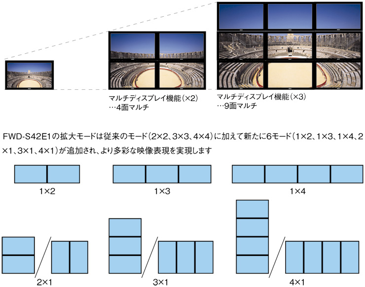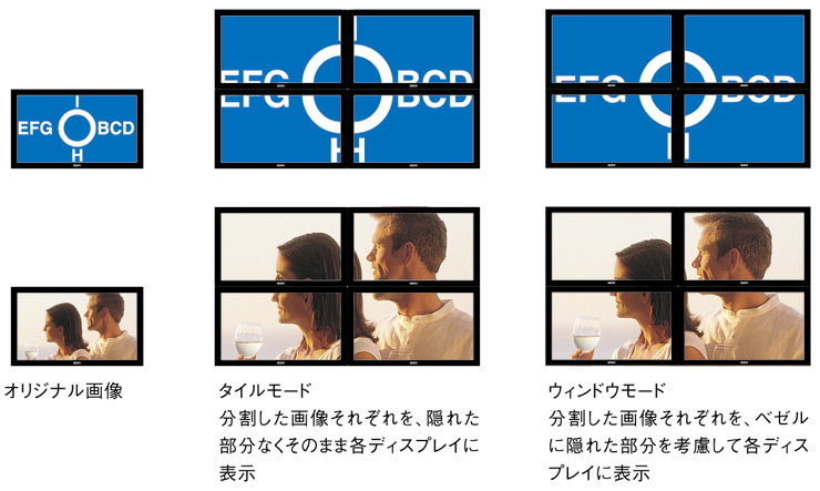 メニューからマルチディスプレイの画面数およびポジションを選ぶだけで、簡単に画面を拡大表示(×2、×3、×4)でき、最大16面までのマルチ画面を構成することが可能です。これにより、映像の演出効果をより高めるダイナミックでスケールの大きい表示が行えます。さらに、表示形式としてタイルモードとウィンドウモードの2種類を用意。コンテンツに応じた使い分けが可能です。