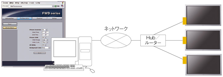 LAN・ WAN・インターネットのWeb画面(IE6.0以上)からディスプレイのコントロール(電源、入力切換、画面調整など)が可能です。また、ディスプレイのステータス、エラー通知を、あらかじめ登録しておいたメールアドレスに送信するメールレポート機能を搭載しています。さらに SNMP(Simple Network Management Protocol)にも対応しています。