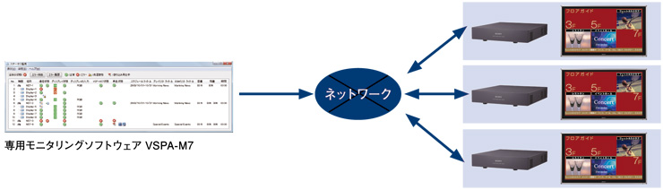 モニタリングソフトウェア「VSPA-M7」は、専用マネジメントソフトウェア「VSPA-D7」で登録したデジタルサイネージプレーヤー「VSP-NS7」に対して定期的にステータス監視を行い、各VSP-NS7の再生状況を表示。ステータス異常をメールやサウンドで通知できます。また、再生結果を CSVファイルで出力することも可能です。