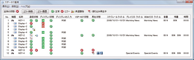各VSP-NS7の現在の運用状態が一覧表で表示され、情報を取得するたびに更新されます。対応ディスプレイ(*)のステータス監視(電源ON/OFF、入力信号状態)も併せて実行します。また、過去に発生したエラーの履歴を表示させ、確認することもできます。