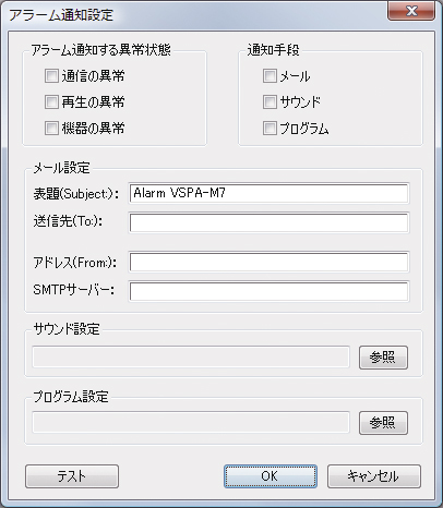 専用モニタリングソフトウェア「VSPA-M7」では、システムにエラーが検出された場合、警告音を鳴らしたり、設定したメールアドレスへ自動的に電子メールを配信するなど、エラーを迅速に通知する設定を行うことができます。