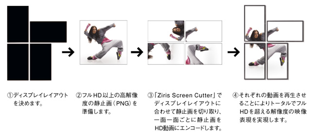 付属ソフトウェア「Ziris Screen Cutter」を使用することで、ディスプレイ1面あたり最大でフルHD(1920×1080)解像度の表示が可能です。高解像度のCGコンテンツをディスプレイのレイアウトに合わせて切り取り、複数のフルHDコンテンツを組み合わせた動画ファイル群を作成することができます。これによりトータルでフルHDを超える解像度を持つビデオウォールを実現します。