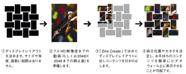 付属ソフトウェア「Ziris Screen Cutter」でディスプレイのレイアウト設定を自由に作成し、そのレイアウトに合わせたコンテンツの配置が可能なため、従来のビデオウォールシステムにはないディスプレイの斜め配置や、サイズの異なるディスプレイの組み合わせが可能です。また、ディスプレイの面数にもシステム上の制限はありません。自由なディスプレイレイアウトを可能にしたことで、映像表現の可能性が広がります。