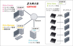 “Ziris Canvas”でビデオウォール型デジタルサイネ-ジを構成する際には、“Ziris Canvas”一式に加え、サイネージ用ディスプレイと専用ソフトウェア(*)をインストールするPCが必要です。