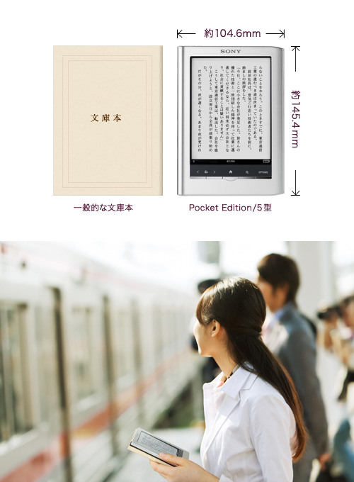 文庫本とほぼ同等の大きさと重さ。わずか約155gの軽量ボディで、片手で持って読んでいても、手が疲れません。電車の中で立ったままでも、読書が楽しめます。