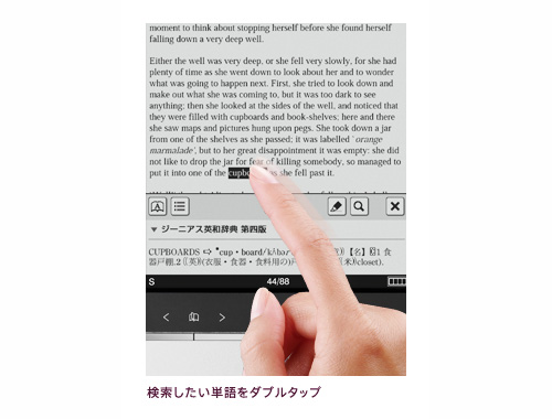 文中のわからない英単語は、内蔵の辞書で調べられます。引き方は簡単。調べたい英単語を軽く2回タップするだけです。また、ソフトウェアキーボードから文字を入力して調べることもできます。