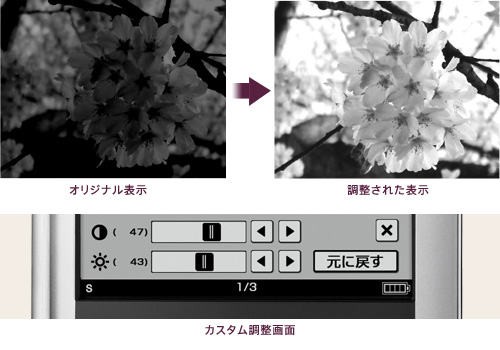 コントラストや明るさを調整して、見やすい画質で表示できます。画質モードを選んで調整できるほか、手動での調整も可能。スキャンしたカラー画像なども、見やすく表示できます。
