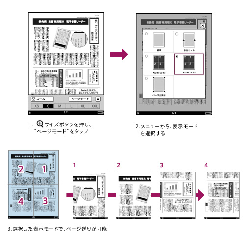 1ページを4分割し、拡大して表示できます。A4サイズ以上の大きなPDFドキュメントなども、しっかり読みやすく表示できます。
