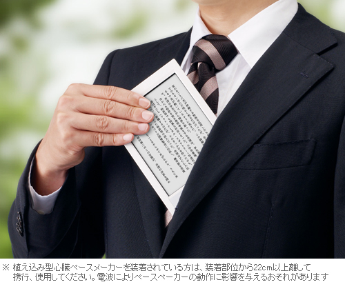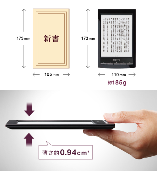 6型の大画面ディスプレイを搭載しながら、約185gの軽さを実現。新書判の本とほぼ同等のサイズで、大画面を気軽に外へ持ちだして、好きなときに好きな場所で快適に読書を楽しめます。背広の胸ポケットやバッグにもすっきり収まるポケットサイズなので、通勤電車の中などでもスマートに取りだせます。