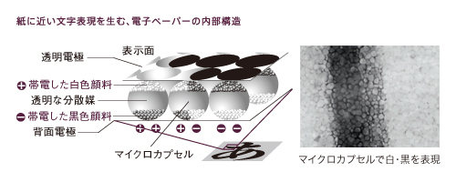 電子ペーパーの内部は無数のマイクロカプセルで構成。マイクロカプセル内の白色・黒色粒子を電流加圧により上下させることによって、白と黒を表示させています。