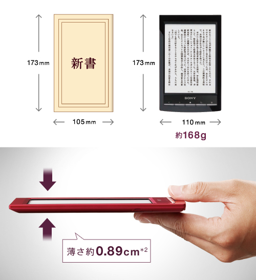 6型の大画面ディスプレイを搭載しながら、約168gの軽さを実現。新書判の本とほぼ同等のサイズで、大画面を気軽に外へ持ちだして、好きなときに好きな場所で快適に読書を楽しめます。背広の胸ポケットやバッグにもすっきり収まるポケットサイズなので、通勤電車の中などでもスマートに取りだせます。