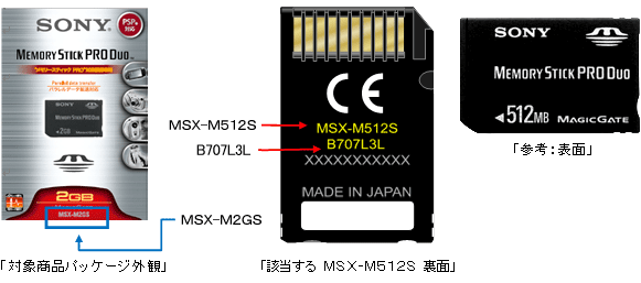 このたび、弊社メモリースティック PRO デュオ™ 「MSX-M2GS」(2GB)の一部におきまして、記録容量の異なる メモリースティック PRO デュオ™ 「MSX-M512S」(512MB)が誤って梱包されていることが判明いたしました。