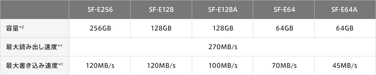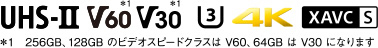 *1 UHS-II対応機器で使用した場合に限ります。UHS-Iおよび従来のSDインターフェースでもご使用いただけますが、速度は測定条件により異なります。これらの値は、当社規定条件でのデータ速度です。データ転送速度の性能を保証するものではありません