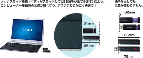 USB端子の出し入れがスムーズな「スライドアップスタイル」が、更に使いやすい「ノックスライド機構」に進化しました。ボールペンのような手軽さでワンプッシュ。コンピューター接続時のわずらわしい手間がなく、キャップをなくす心配もありません。指紋のあとが目立ちにくいシボ加工により、快適にご使用いただけます。