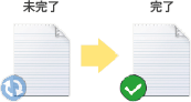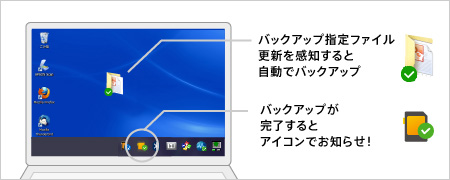 指定されたフォルダ内でファイルが新規作成・上書きされると、直ちにバックグラウンドでバックアップが開始されます。ファイルアイコンに、完了/未完了のマークが表示されるので、