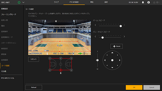 PC・タブレット端末に対応したWebアプリケーションにより、カメラのパン・チルト・ズームなどの操作、PTZオートフレーミング機能に関する各種設定や内部記録の録画、再生操作などが可能。PTZオートフレーミング機能の構図変更など主要な操作はメイン画面上に配置され、現場での運用性を高めます。