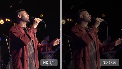 フィルターの透過率を1/4 - 1/128までシームレスに調整。被写界深度を変えずに露出を調整できるほか、オート設定によって常にカメラ側で設定した光量に自動調節できます。外光で明るさが変化する環境での撮影や、照明効果のある舞台の撮影など、さまざまな環境での撮影に対応します。