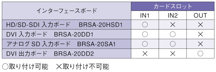 ●豊富な入/出力端子を装備 標準でSDIの4入力4出力、DVI-Iの1出力端子を装備しています。オプションボードを装着することで、SDIの8入力4出力、DVI-Iの1入力2出力まで拡張可能です(入力スロット×2、出力スロット×1を装備)。