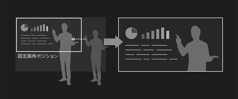 事前に設定した“固定画角ポジション”に被写体が入ると、PTZオートフレーミングを一時停し、設定した画角に自動で遷移します。被写体が設定したポジションを出るまで画角を固定します(*)。黒板やスクリーンなど、人物より優先して視認させたい画角がある場合、人物の追尾とフォーカスしたい画角をカメラが自動で切り替えて撮影します。オンライン参加の人も板書の文字や表示されている資料が動かず、ストレスなく視聴できます。