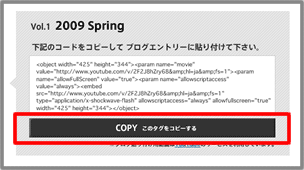 「COPY このタグをコピーする」ボタンを押すか、貼り付け用コードを選択してコピーします。