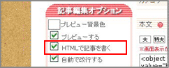 左部メニューの「記事投稿オプション > HTMLで記事を書く」にチェックを入れます。