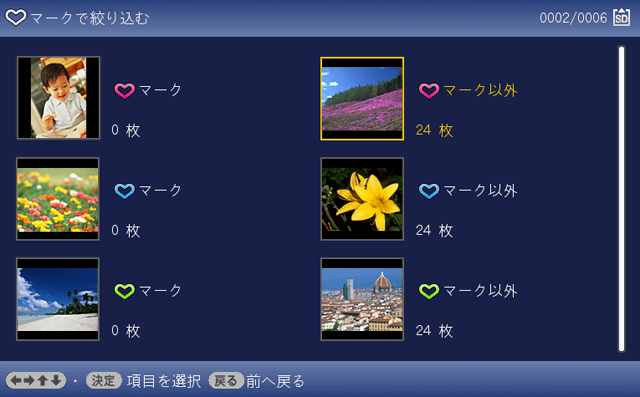内蔵メモリーに保存した写真の中でも、とくにお気に入りの写真にマークを付けて登録できます。あらかじめ写真をセレクトしておけば、スライドショーで写真鑑賞するときも、登録した写真だけを再生できます。
