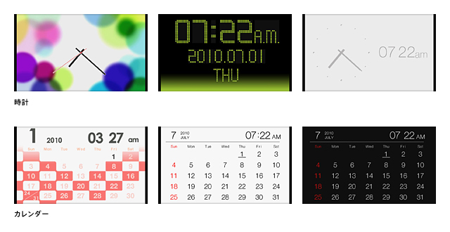 写真や動画は表示せず、時計やカレンダーのみを表示する「時計・カレンダー表示」を搭載。シンプルなアナログ時計やデジタル時計だけでなく、スタイリッシュなデザインの時計・カレンダーも用意。DPF-D720(WI)を使うお部屋の雰囲気に合わせて選べます。