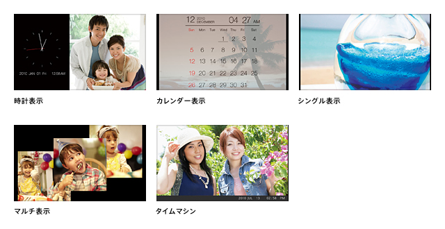 写真や動画が自動で切り替わる「スライドショー」を搭載。時計やカレンダーをモチーフにしたスライドショーや、写真や動画と一緒に撮影日時情報を表示する「タイムマシン」など、計10種類の表示パターンから写真や動画の雰囲気に合ったスライドショーを選べます。