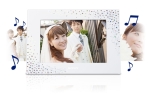 写真にBGMをつけられる「音楽つきスライドショー」に対応。お気に入りの曲といっしょに、思い出の写真をスライドショーで楽しめます。また、BGMはプリインストールされている3曲に加え、最大40曲まで内蔵メモリーに保存できます。