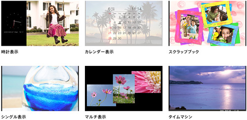 写真をつぎつぎ表示する「スライドショー」を搭載。時計やカレンダーをモチーフにしたスライドショーをはじめ、背景付きの写真を表示する「スクラップブック」や、写真と一緒に撮影日時情報を表示する「タイムマシン」など。ユニークな表示スタイルのスライドショーで写真を鑑賞できます。