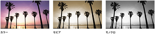 スライドショーで再生する写真の色彩を変えられる「カラー効果」。カラーはもちろん、セピアやモノクロでも表示できます。さらに「くっきり補正」後の画像だけを表示することも可能です。