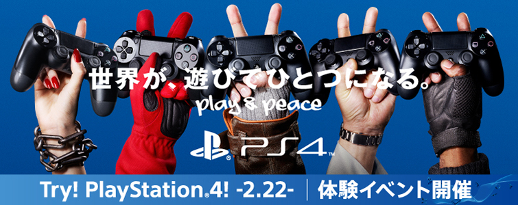 銀座 ソニービルでは、2014年2月1日よりPlayStation®4の体験イベント「 Try! PlayStation®4! -2.22- 」を開催いたします。ソニーショールームでは、PlayStation®4とヘットマウントディスプレーやホームシアターシステムなどのソニー製品を組み合わせた新たな楽しみを体感いただけるスペースとなります。 また、PlayStation®4最新ゲームタイトルもあわせてご用意いたします。