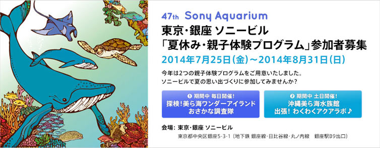 銀座 ソニービルは7月25日(金)〜8月31日(日)まで、沖縄美ら海水族館の監修のもと、ソニービル全館で「47th Sony Aquarium」を開催いたします。2014年3月5日(サンゴの日)に、新しく国立公園指定を受けた沖縄・慶良間(けらま)諸島をテーマに、美しいサンゴ礁の海に生息する生き物たちの世界を水槽と映像で再現します。