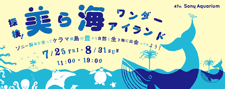 ソニーショールームでは、「探検!美ら海ワンダーアイランド」を開催します。慶良間の美しい自然や、様々な生き物たちが集まる無人島を舞台に、ソニー製品を使いながら島の不思議を探る冒険に出かけましょう。