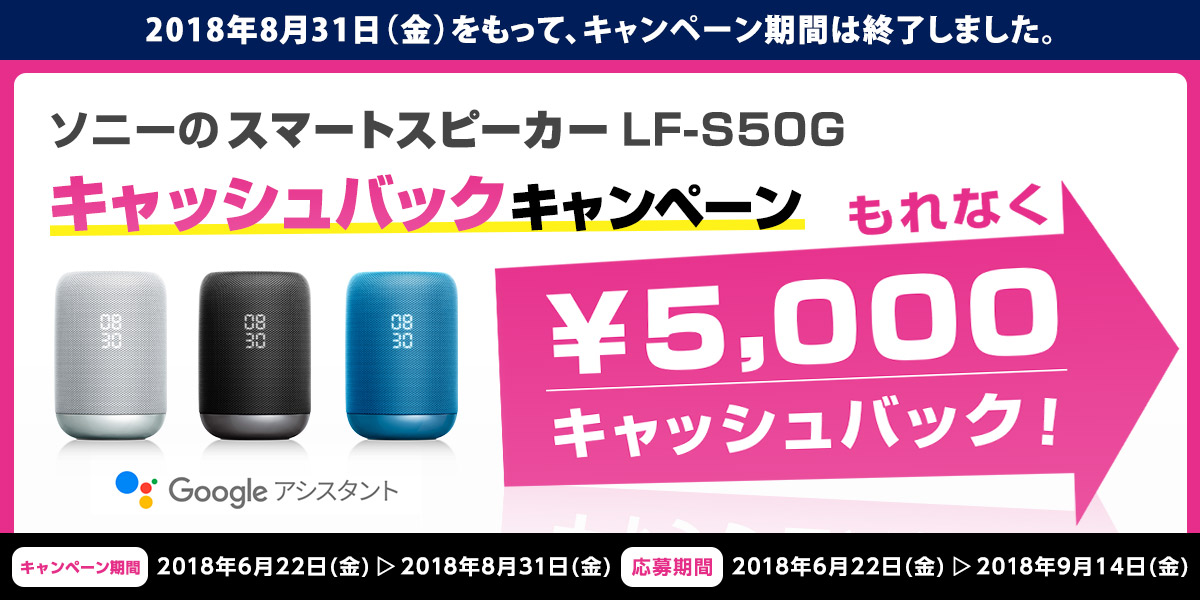 スマートスピーカーキャッシュバックキャンペーン(以下「本キャンペーン」)では、キャンペーン期間内に対象商品を購入し、当社所定の手続きに従い応募期間内に不備なくご応募されたお客様に、5,000円をもれなくキャッシュバックいたします。