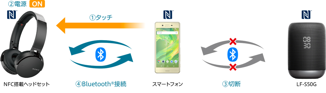 LF-S50GとBluetooth接続中のNFC搭載のスマートフォンや、おサイフケータイ(R)対応Android(TM) 搭載スマートフォンなどをLF-S50G以外のヘッドセットなどのNFC搭載機器にタッチすると、LF-S50GとのBluetooth接続を切断しヘッドセットとBluetooth接続が完了します。