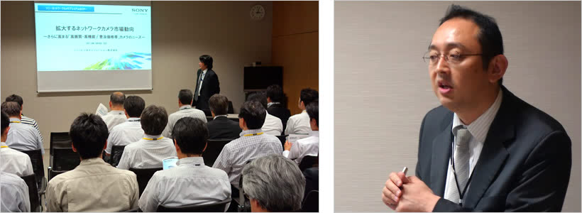 本セミナーでは、タイプ別・価格帯別のソニー出荷実績トレンドを元に、現在急速に拡大する「ネットワークカメラ市場」の最新動向ついてご説明いたしました。また、実機を使ったデモンストレーションにより、「高画質・高性能」を備えるソニーネットワークカメラの活用シーンとその導入効果について広くご紹介いたしました。