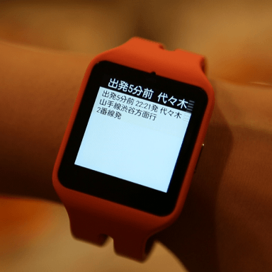 あらかじめ設定したルートの運行状況や乗り換えのナビゲーションを受け取ることができる「乗換案内」。乗車・降車・乗り換えなどの時刻がSmartWatch 3に届くので、乗り遅れや乗り過ごしを防いでくれます。