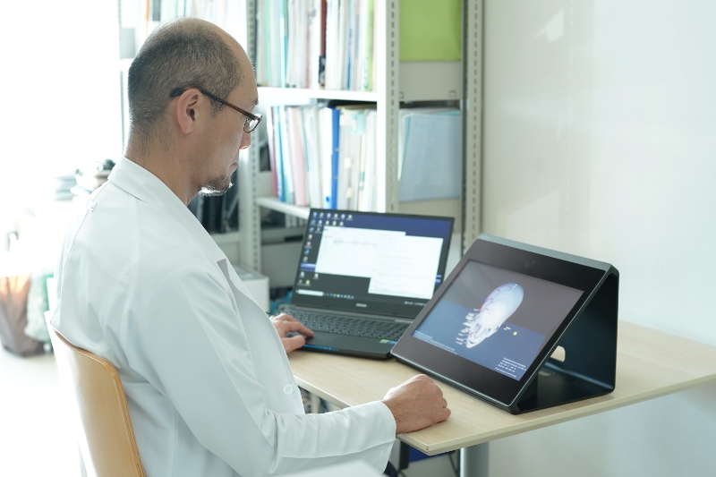 大学病院(東京都)私の研究領域の一つに「VR技術の臨床応用」があるのですが、よりよい診療や教育に生かせる最新の映像技術はないかといつもアンテナを張っています。その一環として、これまではヘッドマウントディスプレイ(以下、HMD)を活用していました。患者さんであるお子さんやご家族にHMDを装着してもらい、STLファイルで作成した3D映像を見せながら病状や手術についての説明を考えていましたが、そういった大事な話をする際にゴーグルで顔が隠れてしまうことでそれまでの空気が途切れてしまうため、相手の目を見て話せないことを以前から課題に感じていました。