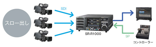 ソニーVTR/DISKプロトコルやVDCPに対応し、スローコントローラーから各チャンネルを独立して制御が可能で、ライブ中継でのスロー再生に対応します。